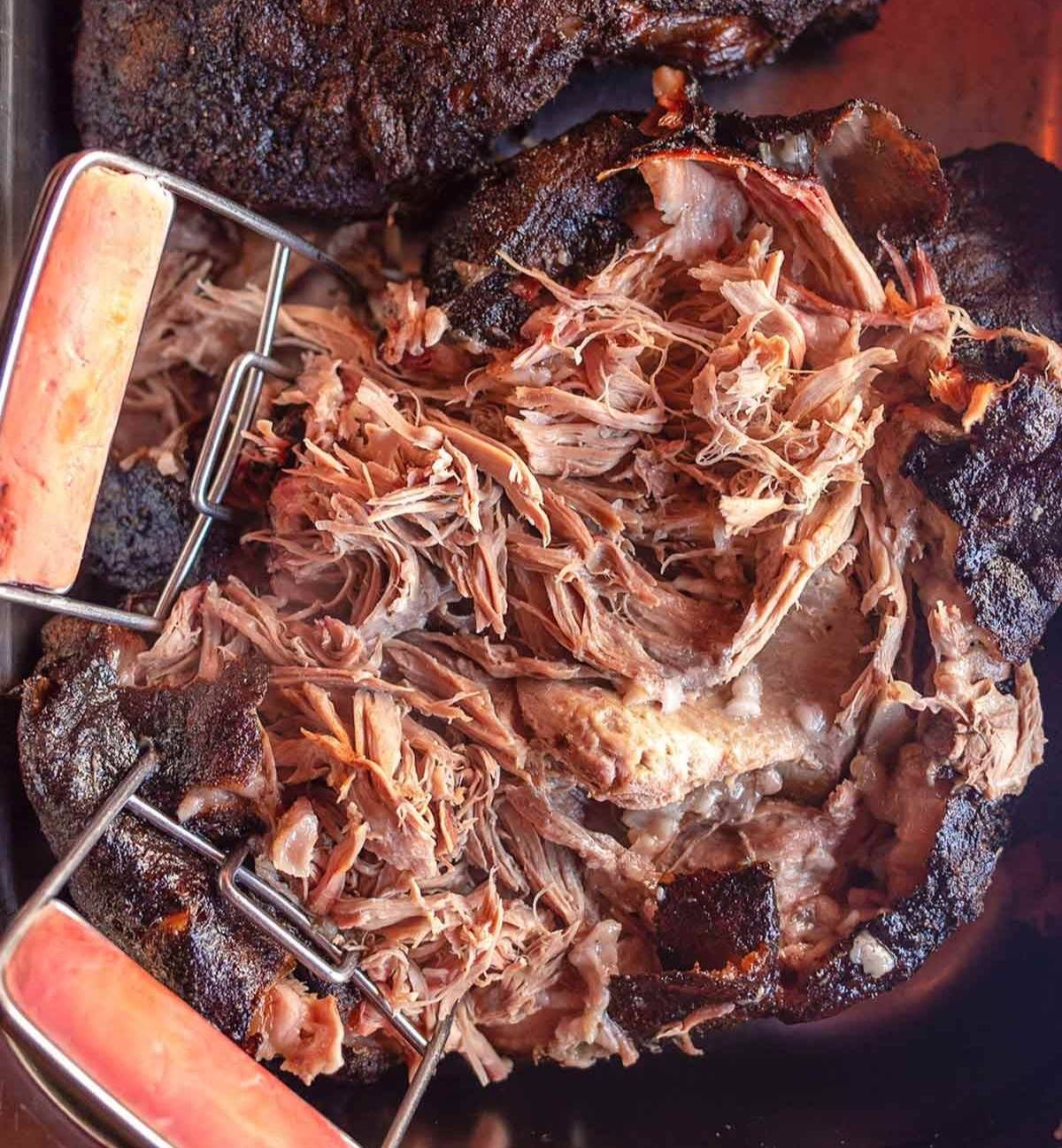 Sooooo many people think that pork butt is the heinie of a pig. It's not. (That’s the ham). Pork butt is actually a squarish cut from the upper shoulder. It’s called a Boston Butt because back in colonial New England, butchers crammed these less-desirable shoulder cuts into specialty barrels called “butts.” It’s basically "barrel meat," but much tastier than that sounds. The pork shoulder (or picnic roast) is the lower, triangular portion—the part that actually contains the elbow. It’s a bit tougher and more muscular. Grocery stores often use the terms interchangeably, and for the recipes below, you can use either. Whether you're Team Butt or Team Elbow, as long as you cook it low and slow, everyone's a winner. Class dismissed. WHAT'S INSIDE...