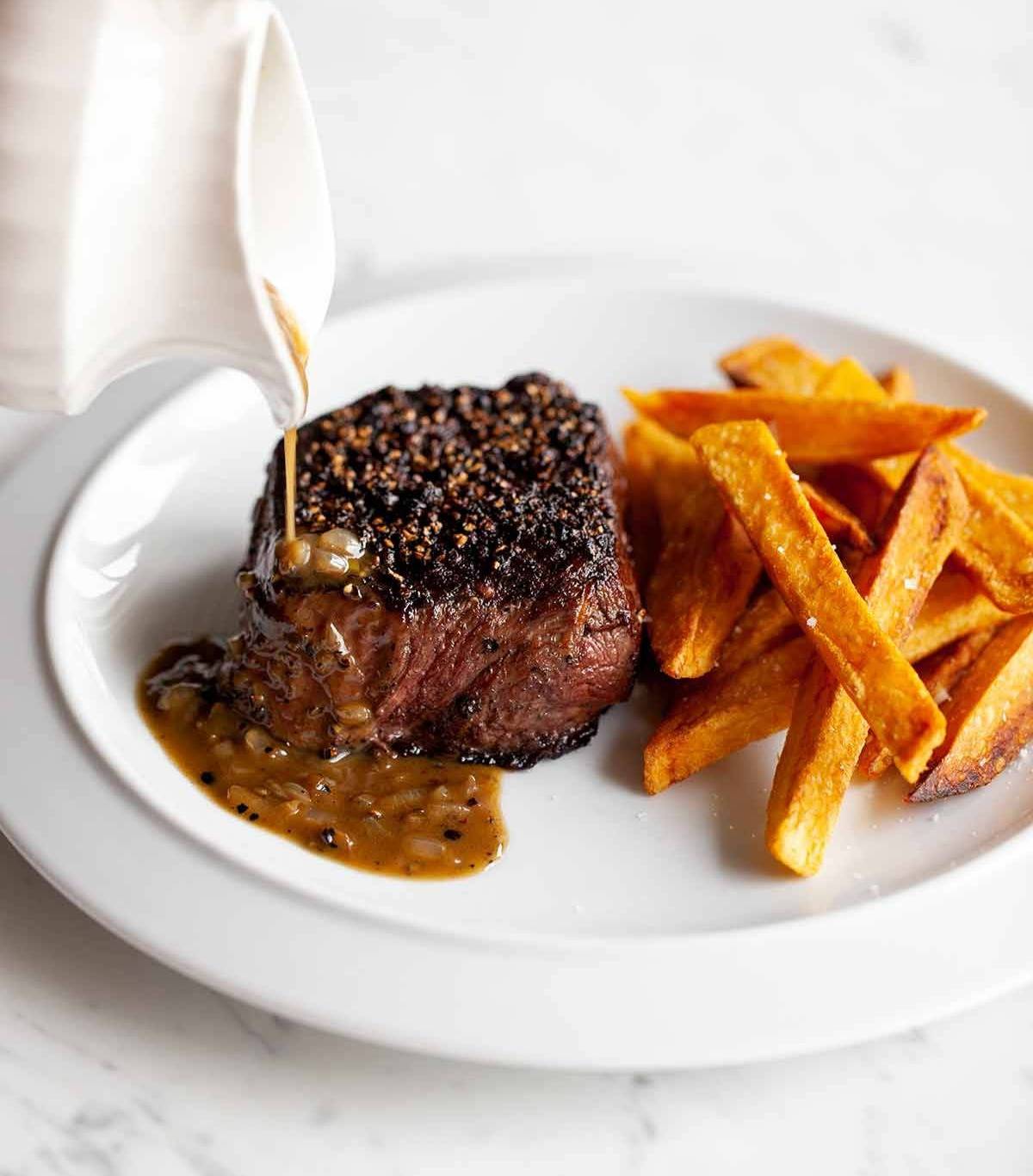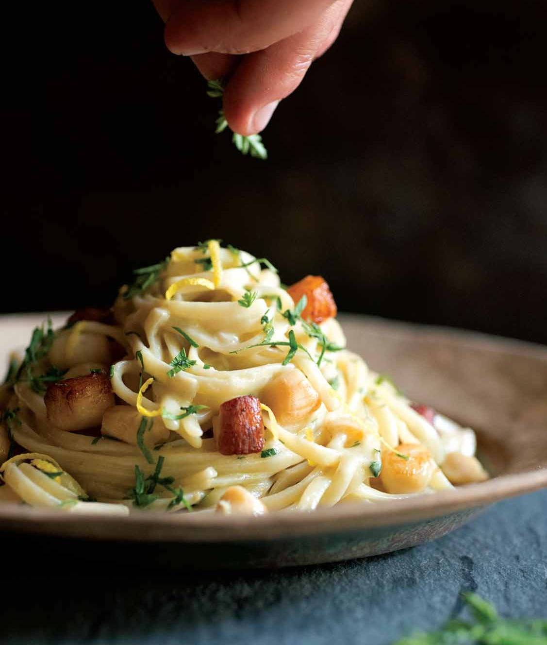 Steak Au PoivreThis steak au poivre from Julia Child is a French classic made with steak encrusted with black, green, white peppercorns, and allspice and drizzled with a Cognac pan sauce.☞ Try This RecipeFrench Roast Chicken ~ Poulet RôtiPoulet rôti, or French roast chicken, is a classic of the Franco culinary empire. And it's so simple: just season a chicken with herbs, place it on top of root vegetables, and, for extra flavor, baste it with plenty of butter. C'est incroyable, non?☞ Try This RecipeRoast Duck Stuffed With Farro, Figs & HazelnutsGolden, crispy roast duck is a festive centerpiece for a celebratory meal, especially when stuffed with sage-scented sausage, red wine-soaked figs, toasted hazelnuts, and farro.☞ Try This RecipeFettuccine With ScallopsThis easy fettuccine with scallops and lemon gets even more extravagant thanks to a cream sauce. Perfect for a no-fail celebration of any sort.☞ Try This RecipeDuck Confit